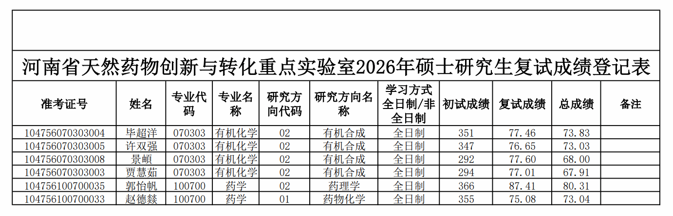 河南省天然药物创新与转化重点实验室2026年硕士研究生复试成绩单