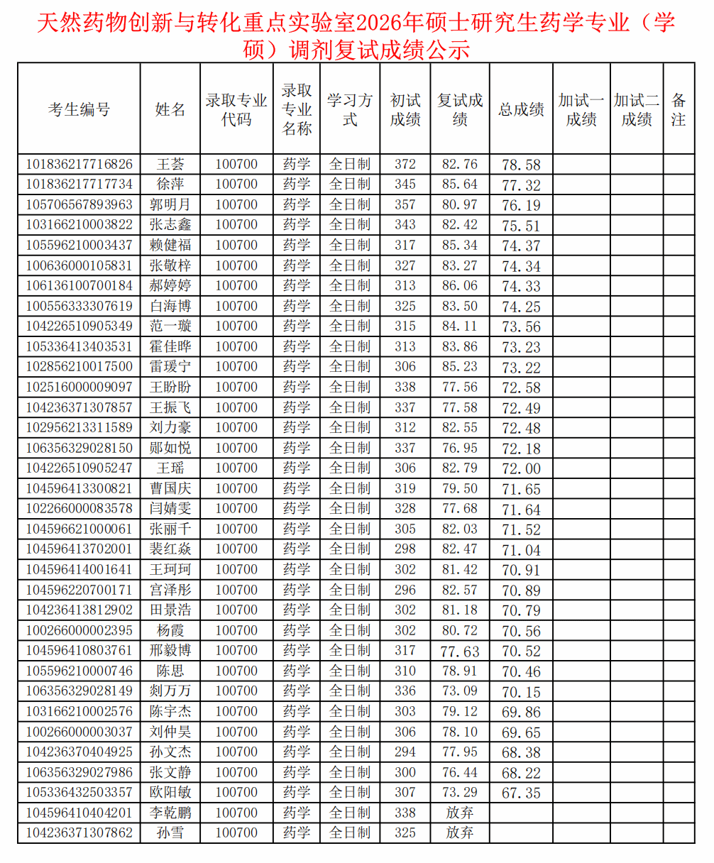 2026年学院硕士研究生调剂复试成绩公示(药学专业学硕1007)