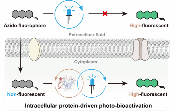 在生物医学领域,尤其是细胞生物学研究中,叠氮化分子凭借其独特的高反应活性,被广泛应用于蛋白质组学、细胞标记与成像研究等多个关键领域。然而,它们在细胞内的确切转化机制仍不清楚。在此研究中,团队首次阐明了叠氮化荧光分子的一种新型“光-生物活化机制”,即叠氮化荧光分子在光照及细胞内生物酶联合作用下,可迅速发生叠氮基团解离并激活荧光信号的分子路径。基于该机制,成功实现了在时间与空间维度上对细胞的精准调控成像。